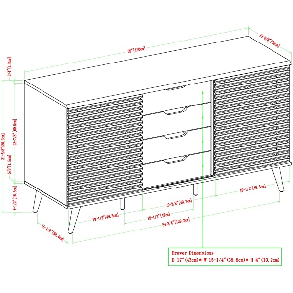 Ships ready-to-assemble with step-by-step instructions. Includes cord management ports and accommodates TVs up to 65”. 4 Drawers and 2 Sliding Slat Doors for Customizable Storage. Made of warp-resistant and high-grade MDF and durable laminate. 32" H x 59" L x 19.75" W.