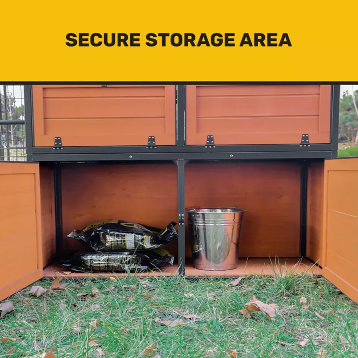 - Secure storage area comes in handy for feed, cleaning supplies and more